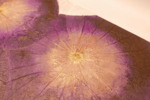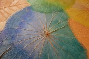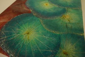 在木製畫板上黏貼真實的蓮葉等材料,然後進行上色。